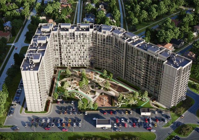 Первые этажи с помещениями общественного назначения объединены в один общий стилобат с одноэтажным ритейлом с эксплуатируемой кровлей. Из каждой башни можно легко попасть в лобби, бассейн со SPA-комплексом, фитнес-зал, паркинг не выходя на улицу.