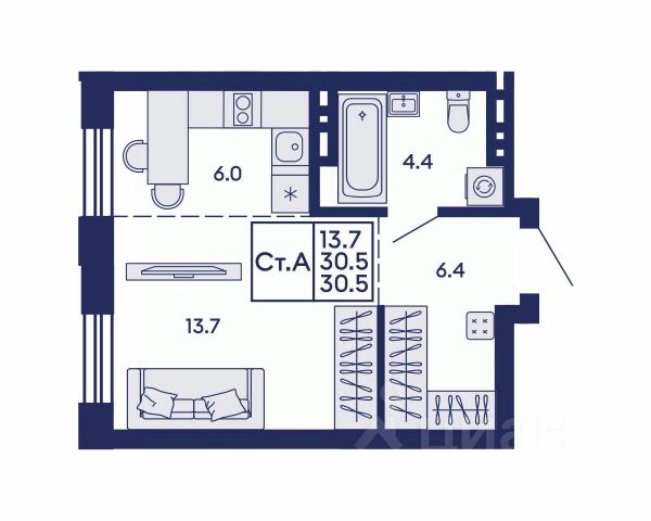 Предлагаем в продажу замечательную квартиру-студию на комфортном 4 этаже с большой комнатой, функциональным коридором и лоджией с прекрасным видом на чистый зеленый двор и детскую площадку.