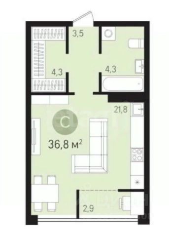 Общая площадь: 37,4 м²