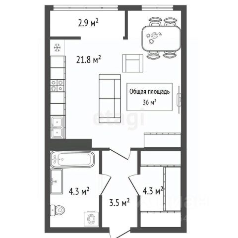 Общая площадь: 37,4 м²