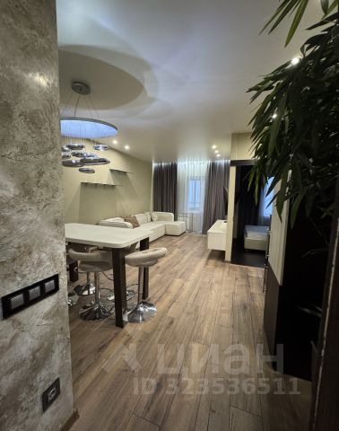 Кухня-гостиная оснащена необходимым гарнитуром, встроенной бытовой техникой (холодильником, духовым шкафом, микроволновой печью, варочной панелью, посудомоечной машиной), в гостиной зоне есть телевизор, раздвижной кухонный стол, 4 стула и раскладной диван. Дополнительно установлен кондиционер. Прихожая оборудована вместительной гардеробной системой. Материалы пола - керамогранит и паркет.