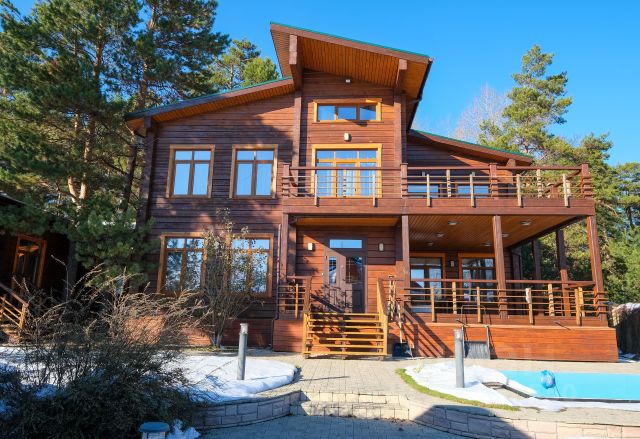 На земельном участке 10 соток продается строение общей площадью 574 кв.м., состоящее из жилого дома общей площадью 470 кв.м. и примыкающего к нему банного комплекса с бассейном общей площадью 104 кв.м. Также на земельном участке находятся два гаража, площадью 45,5 кв.м. и 26 кв.м.