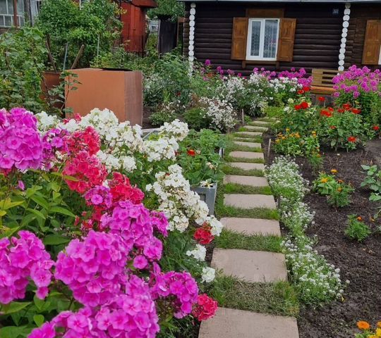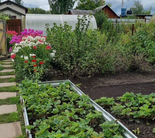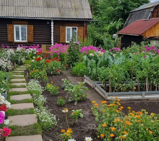 Большое количество многолетних цветов (розы 35 шт., гартензии, розарий, клематисы, пионы, лилейники, астильбы, хосты и т.д), зона отдыха -газон и посадки (девичьий виноград 3 куста, кусты смородины 9 шт. черной и 1 куст белой смородины, малины 2 ряда, крыжовника 2 куста, жимолость, черноплодная рябина , облепиха 3 дерева).