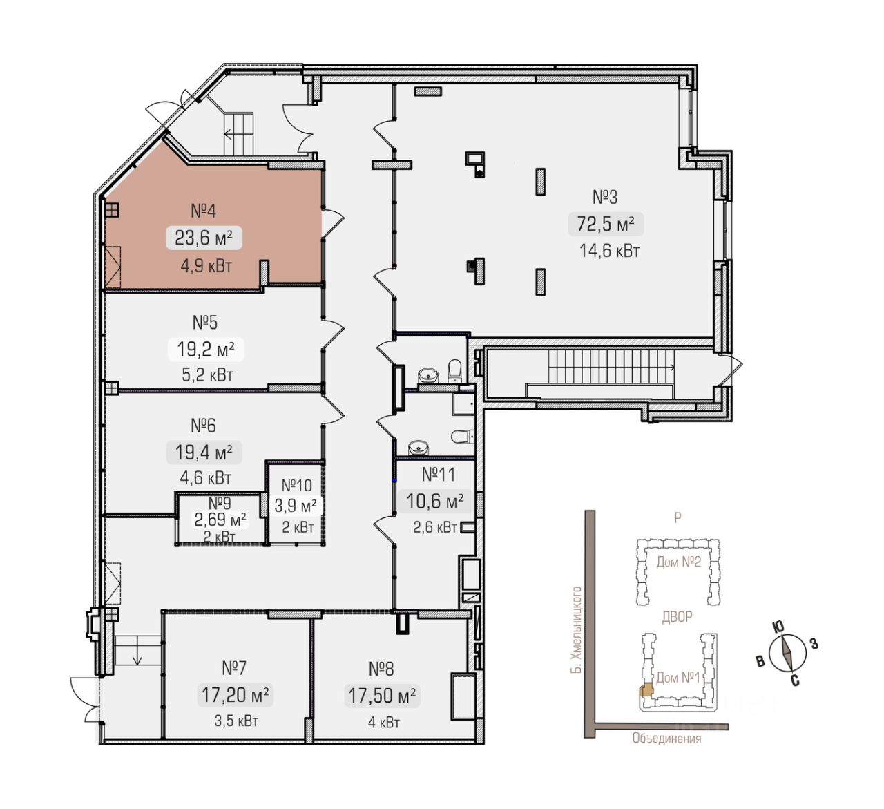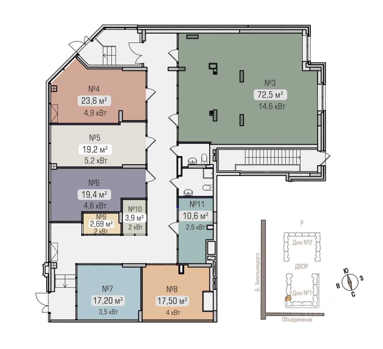 - Помещения 3,4,5,6 оборудованы витражными витринами, выходящими на ул.Богдана Хмельницкого и внутренними входами с витражным остеклением.