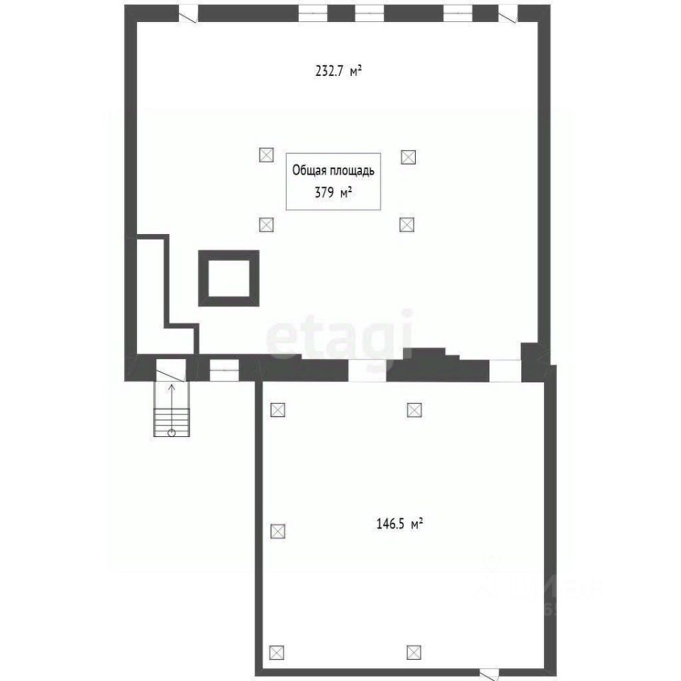 Площадь помещения - 379 кв.м, высота потолков 4,6 м до плиты перекрытия.