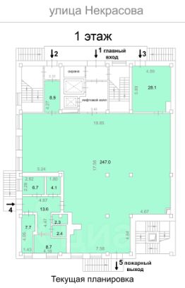 Предлагаемая площадь, от 70 м² до целого этажа, 345 м². Текущая и предлагаемая планировки в фотографиях в объявлении. Возможна и иная конфигурация, помещение колонного типа, планировка возможна практически любая. Перегородки установят после согласования с арендатором