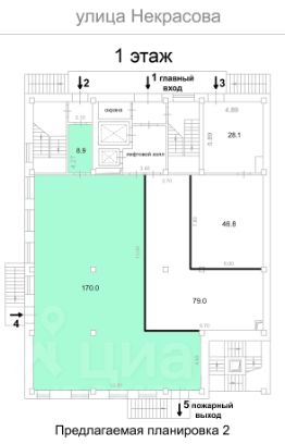 Предлагаемая площадь, от 70 м² до целого этажа, 345 м². Текущая и предлагаемая планировки в фотографиях в объявлении. Возможна и иная конфигурация, помещение колонного типа, планировка возможна практически любая. Перегородки установят после согласования с арендатором