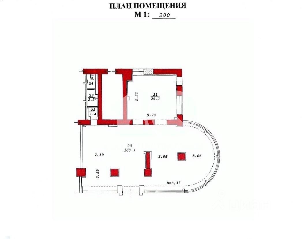 Помещение площадью 142,3 кв. м расположено на первом этаже пятиэтажного кирпичного здания. Высота потолков 3,37 м создаёт простор и позволяет эффективно использовать пространство. Отдельный вход и свободный доступ в помещение обеспечивают удобство для посетителей и сотрудников.