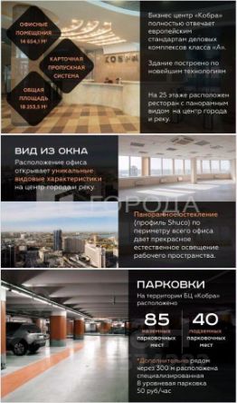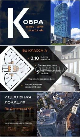 БЦ "Кобра" - это удобный, стильный, 25-этажный бизнес-центр класса А, с отличной транспортной доступностью, расположен в самом центре, на главной прогулочной улице города.