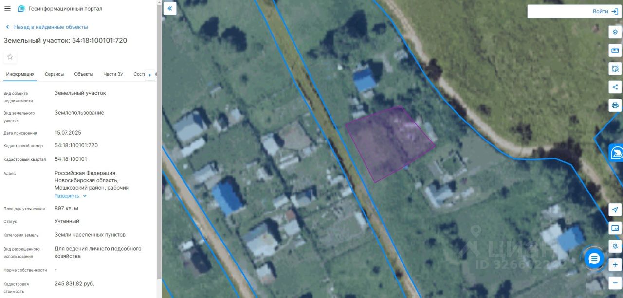 Земельный участок с кадастровым номером 54:18:100101:720, местоположение: Российская Федерация, Новосибирская область, Мошковский район, рабочий поселок Мошково, р.п. Мошково, улица Юбилейная. Площадь земельного участка 897 кв.м. Категория земель земли населенных пунктов. Разрешенное использование для ведения личного подсобного хозяйства.
