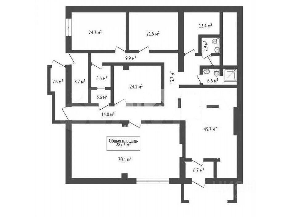 Планировка: зона ресепшен, 4 отдельных кабинета, 2 санузла.