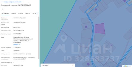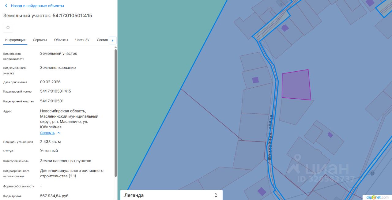 Земельный участок с кадастровым номером 54:17:010501:415 площадь 2438 по адресу Новосибирская область, Маслянинский муниципальный округ, р.п. Маслянино, ул. Юбилейная