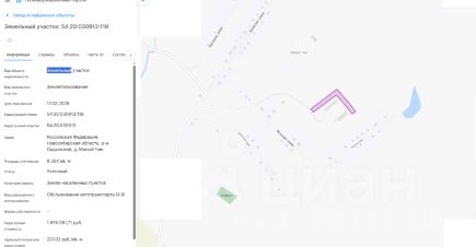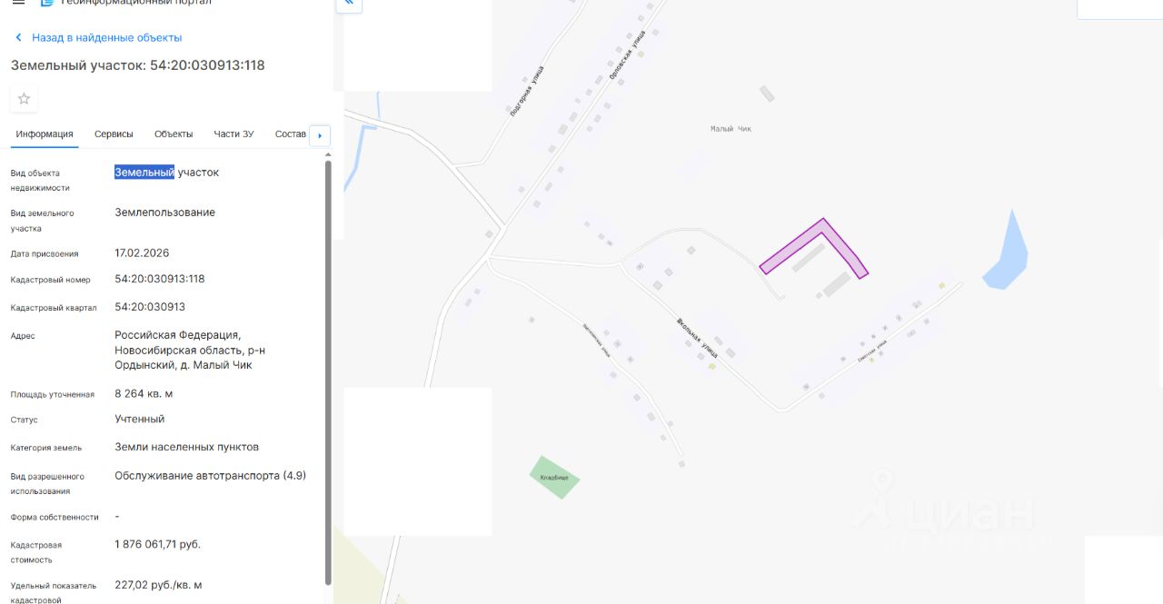 Земельный участок с кадастровым номером 54:20:030913:118 площадь 8264 по адресу Российская Федерация, Новосибирская область, р-н Ордынский, д. Малый Чик