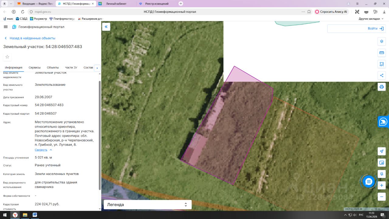Земельный участок, адрес: Местоположение установлено относительно ориентира, расположенного в границах участка. Почтовый адрес ориентира: обл. Новосибирская, р-н Черепановский, п.Грибной, ул. Луговая, 8, кадастровый номер 54:28:046507:483