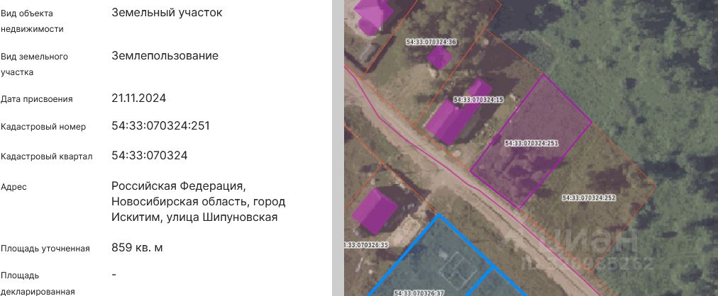земельный участок с местоположением: Российская Федерация, Новосибирская область, город Искитим, улица Шипуновская, кадастровый номер 54:33:070324:251, площадью 859 кв.м., категория земель "Земли населенных пунктов", вид разрешенного использования: для индивидуального жилищного строительства (2.1).