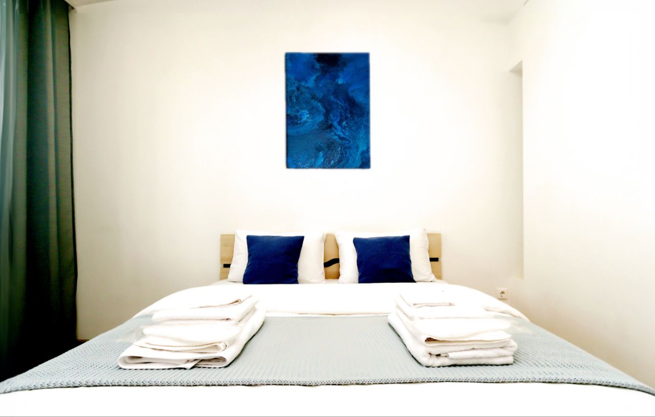 Квартира оснащена всем необходимым для комфортного проживания: от качественного постельного белья из натуральных тканей до полного набора кухонной техники.
