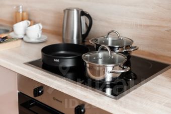 Отдельная кухня оснащена современной бытовой техникой: холодильником, микроволновой печью, электрической плитой и духовкой, а также всем необходимым для приготовления еды.