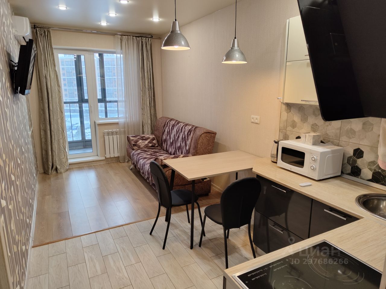 Из техники в наличии: холодильник, плита, вытяжка, микроволновая печь, чайник, кондиционер, два телевизора, стиральная машина.