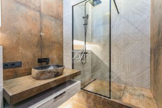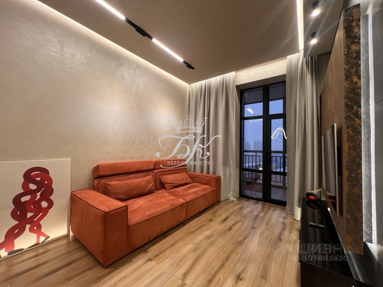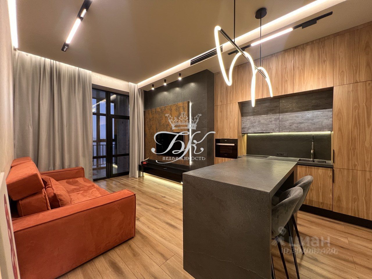 Квартира выполнена в современном стиле и укомплектована мебелью и встроенной бытовой техникой.