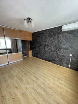 Установлен кондиционер, в квартире есть большой телевизор, большой встроенный шкаф, рабочий стол и тумбочка с ящиками, диван купим по запросу. Так же есть стиральная машинка, холодильник, микроволновка, варочная панель (без духовки), барная стойка, стол на кухне складной (на фото). Уютный балкон на кухне, обшитый деревом.