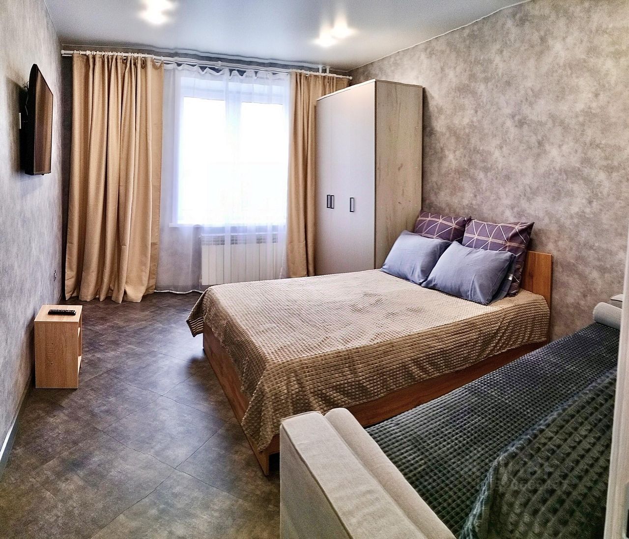 Возможно размещение от 1 до 3 человек на спальных местах: - диван для 2-х человек; - диван-кровать для 1 человека. - постельное бельё и полотенца; - подушки: 7070 2 шт, 5070 2 шт, одеяло. - телевизор, шкаф для вещей. КУХНЯ: - телевизор; - варочная поверхность; - посуда для приготовления и приема пищи: столовые приборы для 3-х человек, набор посуды на 3 персоны; - кастрюли, сковороды; - холодильник, чайник, микроволновка.