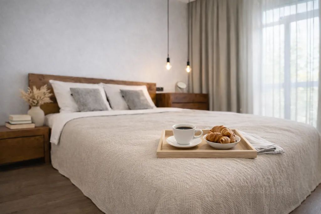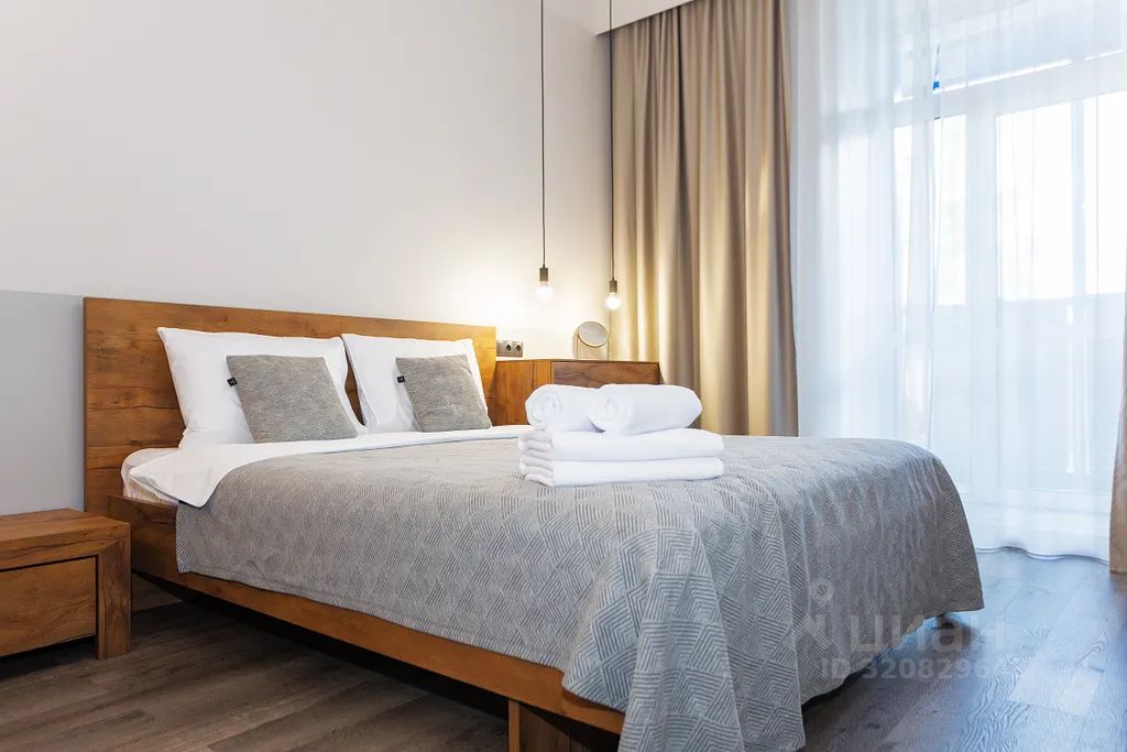 Двуспальной кроватью с ортопедическим матрасом, заправленной чистым постельным бельём