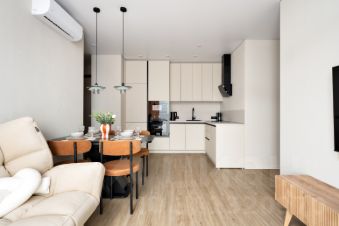 Две полноценных кровати (160см) в спальнях и раскладной диван в гостиной, три телевизора (в каждой комнате), два санузла, два кондиционера, бойлер, два открытых балкона, посудомоечная машина, духовой шкаф, кофеварка - топ забыта о наших гостях