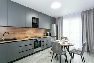 Полная комплектация: Вся необходимая бытовая техника (холодильник, плита, духовка, стиральная машина), фен, утюг с гладильной доской.