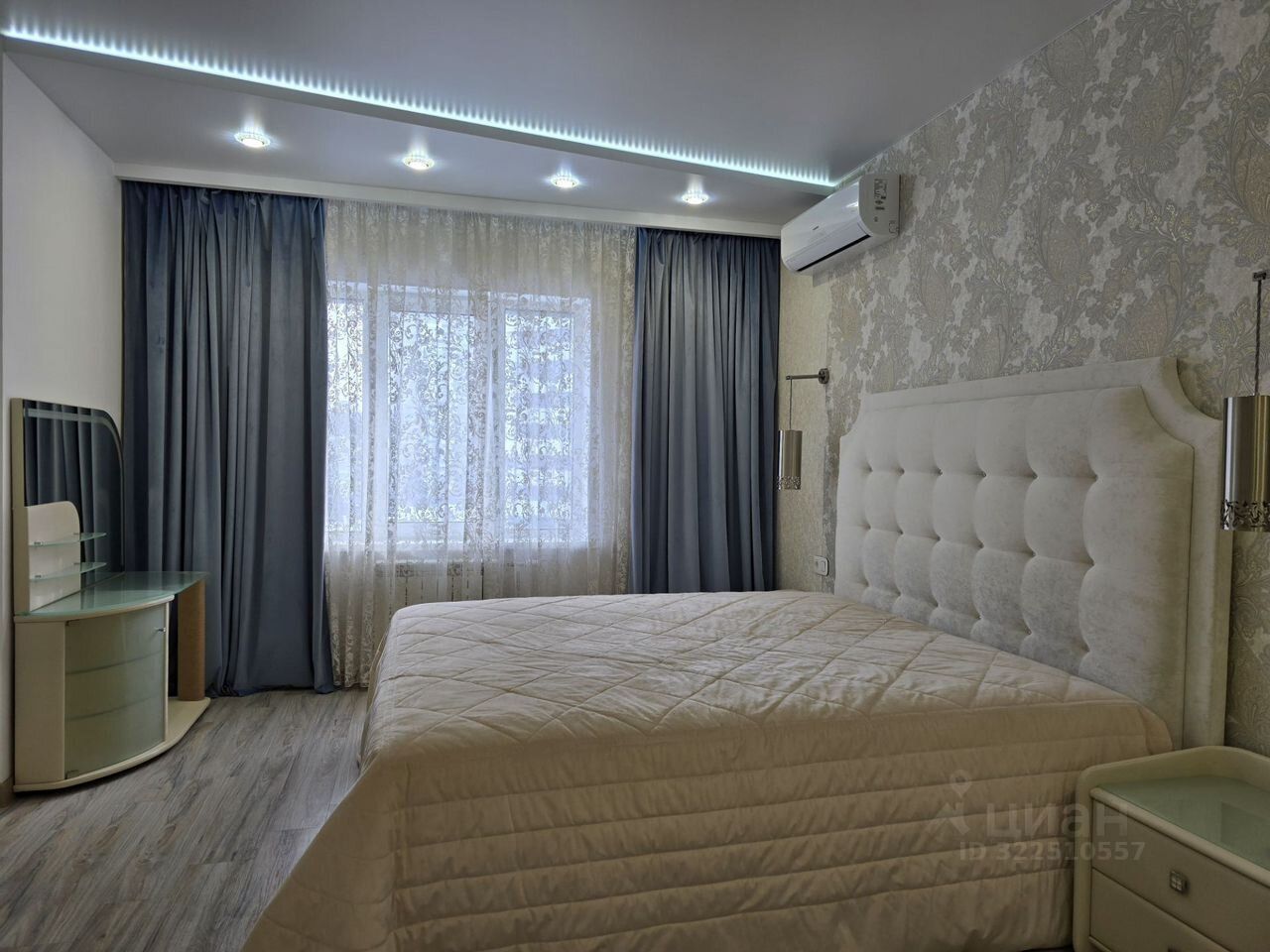 В спальне расположена кровать с подъемным механизмом и местом для хранения (спальное место 180*200, матрас новый), 2 тумбы, туалетный столик и большое зеркало. Всё это изготовлено компанией Dream Land. Встроенный шкаф выполнен из тех же тканей, что и весь комплект мебели. Шторы на подкладе (можно комфортно спать даже днём). Весь текстиль в квартире от Togas.