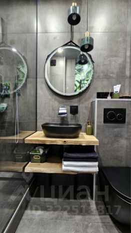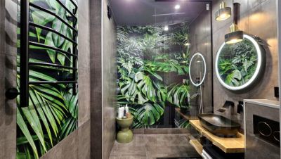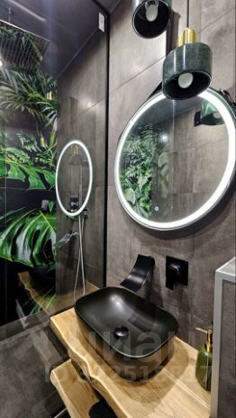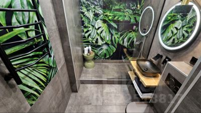 - Ванная комната оборудована просторной душевой кабиной и большой лейкой с тропическим душем. Панно с растительным рисунком - печать на керамограните по индивидуальному заказу, которое гармонично сочетается с подвесными светильниками из натурального мрамора изумрудного цвета. Так же для комфортного проживания предусмотрены электрический полотенцесушитель и проточный водонагреватель.