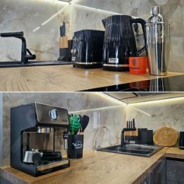- Просторная кухня оборудована всем необходимым: встроенным холодильником, плитой на 4 конфорки, духовым шкафом, микроволновой печью, чайником. Так же имеется телевизор, стиральная машина, кондиционер. Для любителей кофе и неторопливого утра предусмотрена рожковая кофемашина и тостер.У окна разместилась обеденная зона на 4 персоны с невероятно удобными стульями HERMES. Над столом подвесная инсталляция Muscularity от ирландской художницы и дизайнера Niamh Barry.