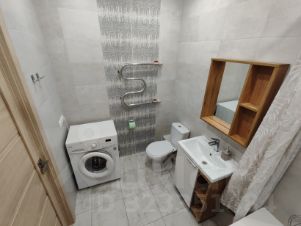 Ванная комната — новая сантехника, мебель, стиральная машина, ванна.