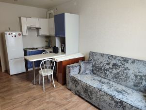 Квартира с евроремонтом, поэтому все в отличном состоянии и готово к комфортному проживанию. В студии есть необходимая мебель как для кухни, так и для жилой зоны, и будет шкаф-купе в коридоре, а также вся необходимая техника: холодильник, телевизор и стиральная машина. Ванная комната оборудована ванной, что позволяет расслабиться после долгого дня. Совмещенный санузел выполнен в современном стиле.