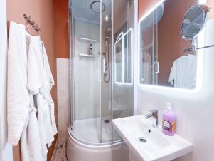 В квартире есть всё необходимое для комфортного проживания посуда, мебель, постельное бельё, халаты, средства гигиены, чай, кофе, электроплита, водонагреватель, СВЧ печь, электрический чайник, утюг с гладильной доской, фен,