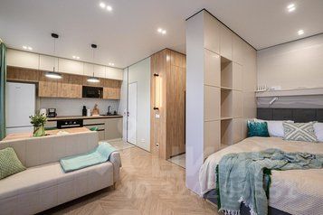 Не смотря на компактный размер, в студии продумано множество мест для хранения, шкафы в потолок и удобные полки: все сумки и чемоданы можно убрать до следующего использования.