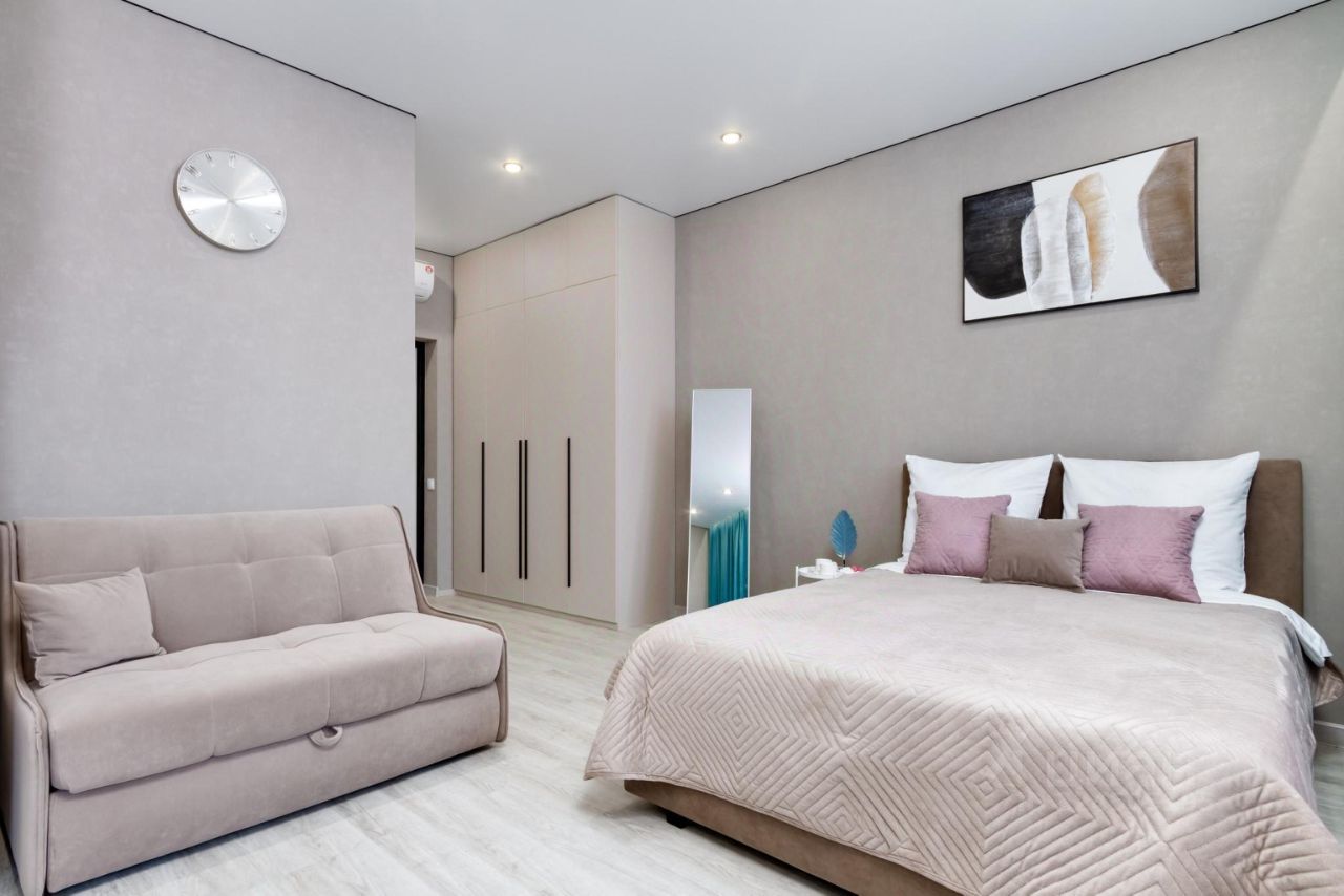 Апартаменты расположены на 15 этаже в новом доме (2025год постройки). Выполнены в современном стиле, очень удобны и функциональны. Высокие потолки, тёплые и уютные цветовые решения в дизайне, разные сценарии освещения создают уют и спокойствие.