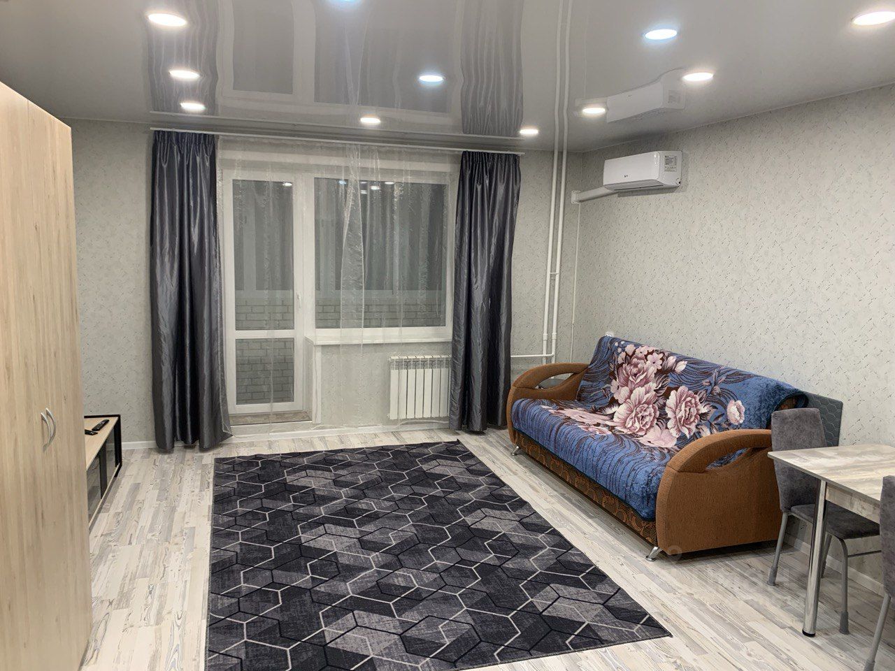 В студии сделан качественный евроремонт, что создаёт атмосферу уюта и комфорта. Кухня оборудована всей необходимой мебелью и техникой, включая холодильник и кондиционер. В комнате также есть мебель, а в ванной комнате установлена ванна. Для вашего удобства в квартире есть стиральная машина и телевизор. Имеется выход на балкон, где можно наслаждаться свежим воздухом.