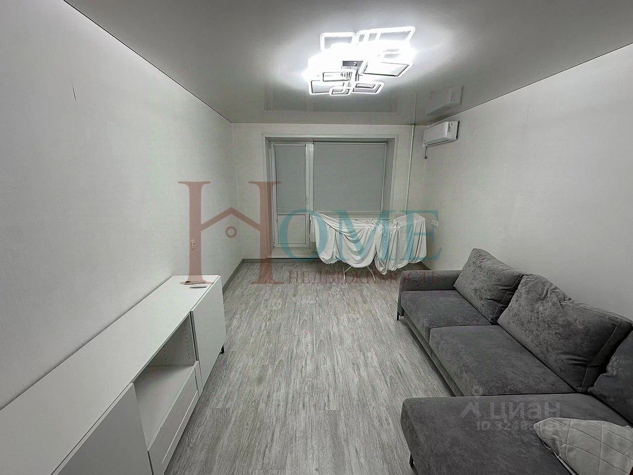 Гостиная: свежий диван, стеллаж под тв с диагональю 65 — 70 дюймов, также выход на балкон, балкон тоже обшит, также имеется кондиционер, можно использовать до -5 градусов.