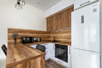- Полноценная кухня с варочной индукционной поверхностью, холодильником, свч печью, электрочайником, микроволновкой и всей необходимой посудой и кухонной утварью;