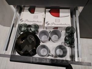 — кухонный гарнитур с необходимой бытовой техникой: варочная плита, вытяжка, холодильник, чайник, микроволновая печь;