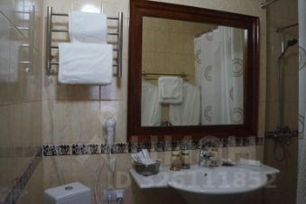 В ванной комнате: душевая кабина, каменная столешница; зеркало; фен; банный халат; тапочки; косметический набор.