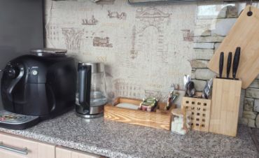 На кухне: фильтр для воды, плита, чайник, микроволновая печь, холодильник, кофемашина, обеденный стол и стулья, вся необходимая посуда.