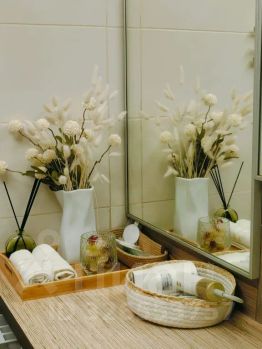 В ванной комнате: стиральная машина, фен, тапочки, мыло, гель для душа, средства гигиены, гладильная доска, утюг. На каждого гостя комплект из 3-х полотенец.