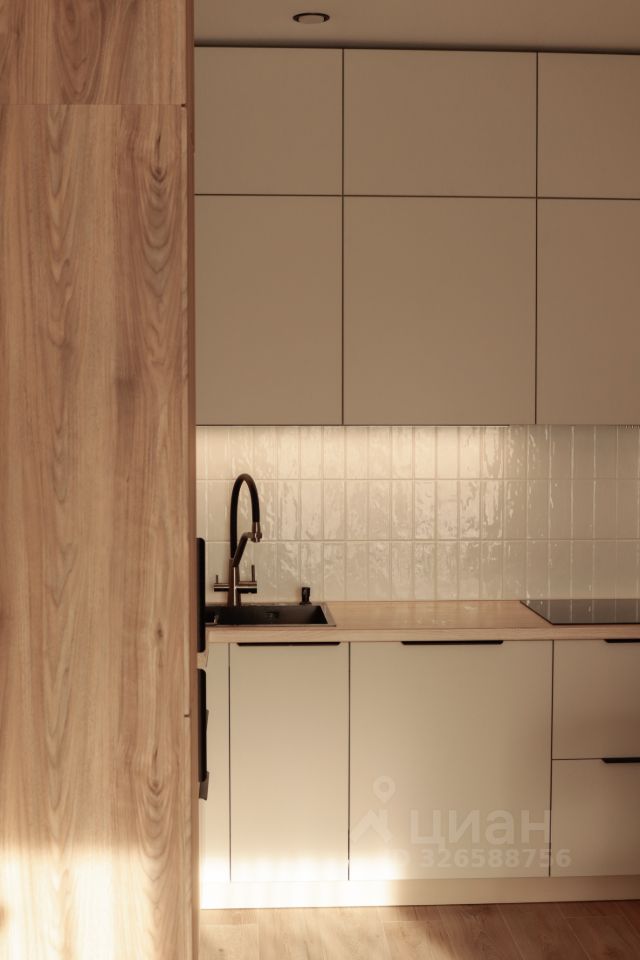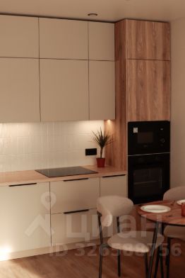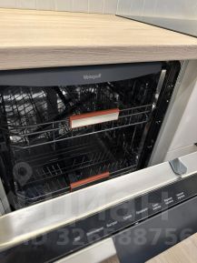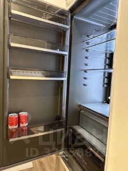 На кухне встроенный холодильник, духовой шкаф, микроволновка, посудомоечная машина, фильтр для воды, чайник, посуда и столовые приборы.