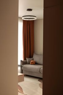В зоне гостиной большой удобный диван, телевизор, к лету установим кондиционер, также в квартире останется робот-пылесос.