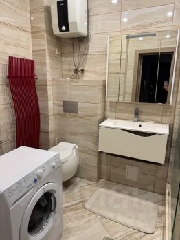 Пространство грамотно зонировано, что делает проживание максимально комфортным. В квартире есть вся необходимая мебель и техника: кондиционер, холодильник, телевизор и стиральная машина, бойлер. В совмещенном санузле установлена душевая кабина.