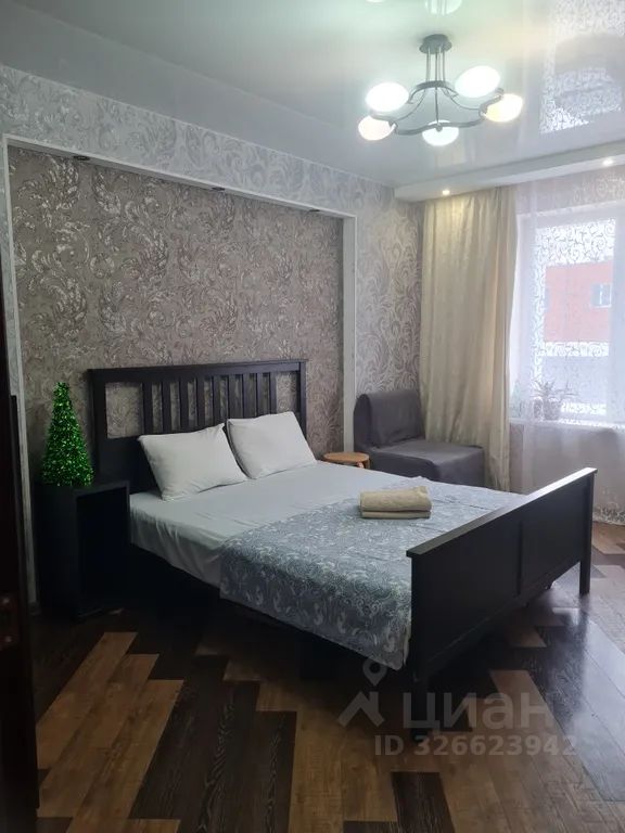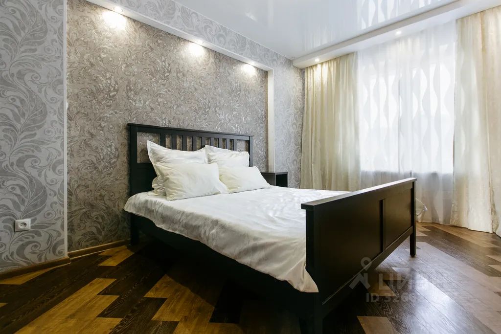 Большая 2х спальная кровать, кожаный диван, журнальный столик, платяной шкаф.