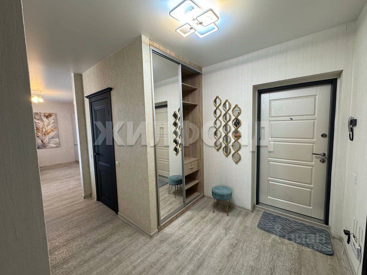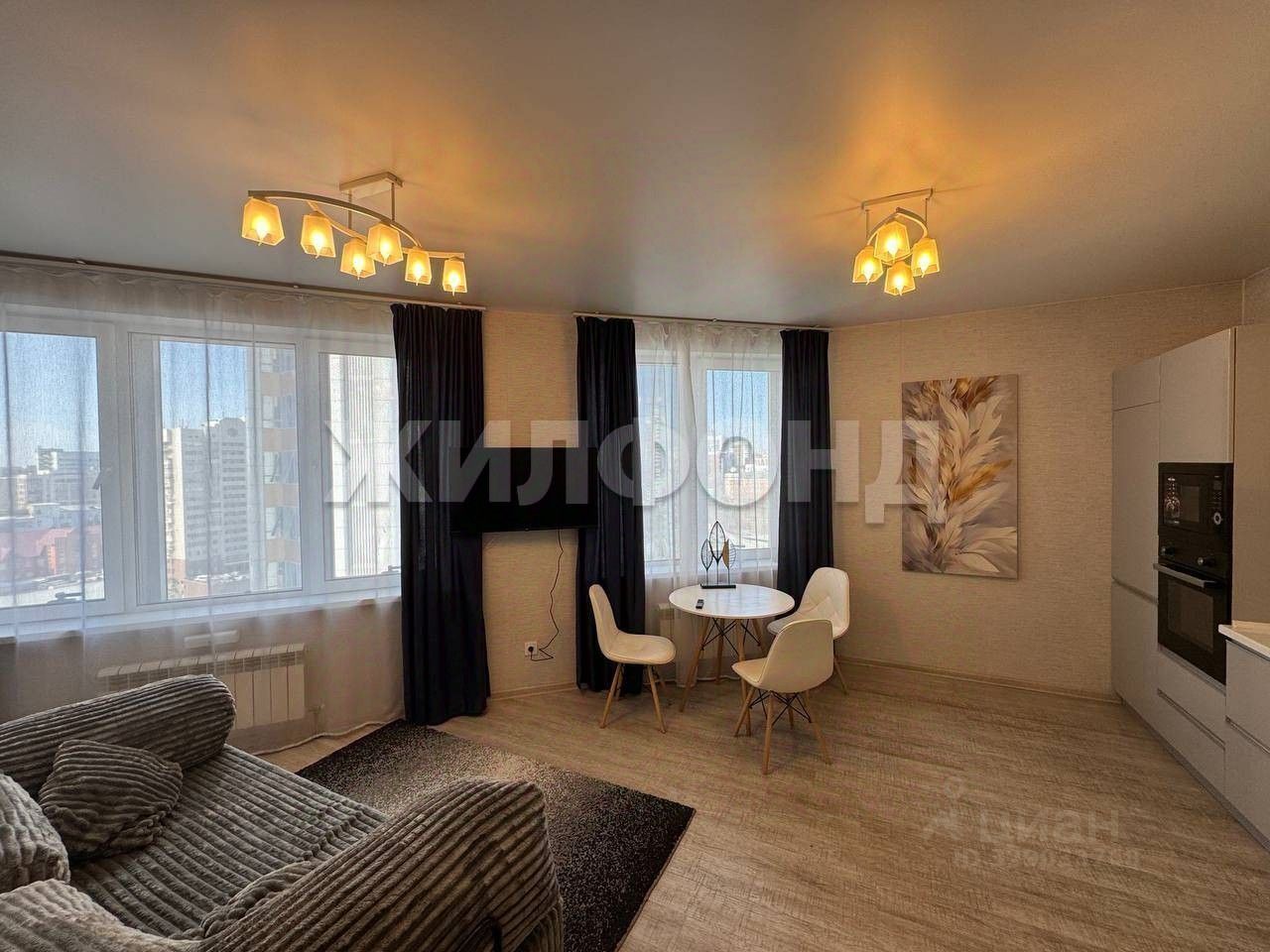 2 комнаты и кухня-гостиная, спальня с гардеробной комнатой.