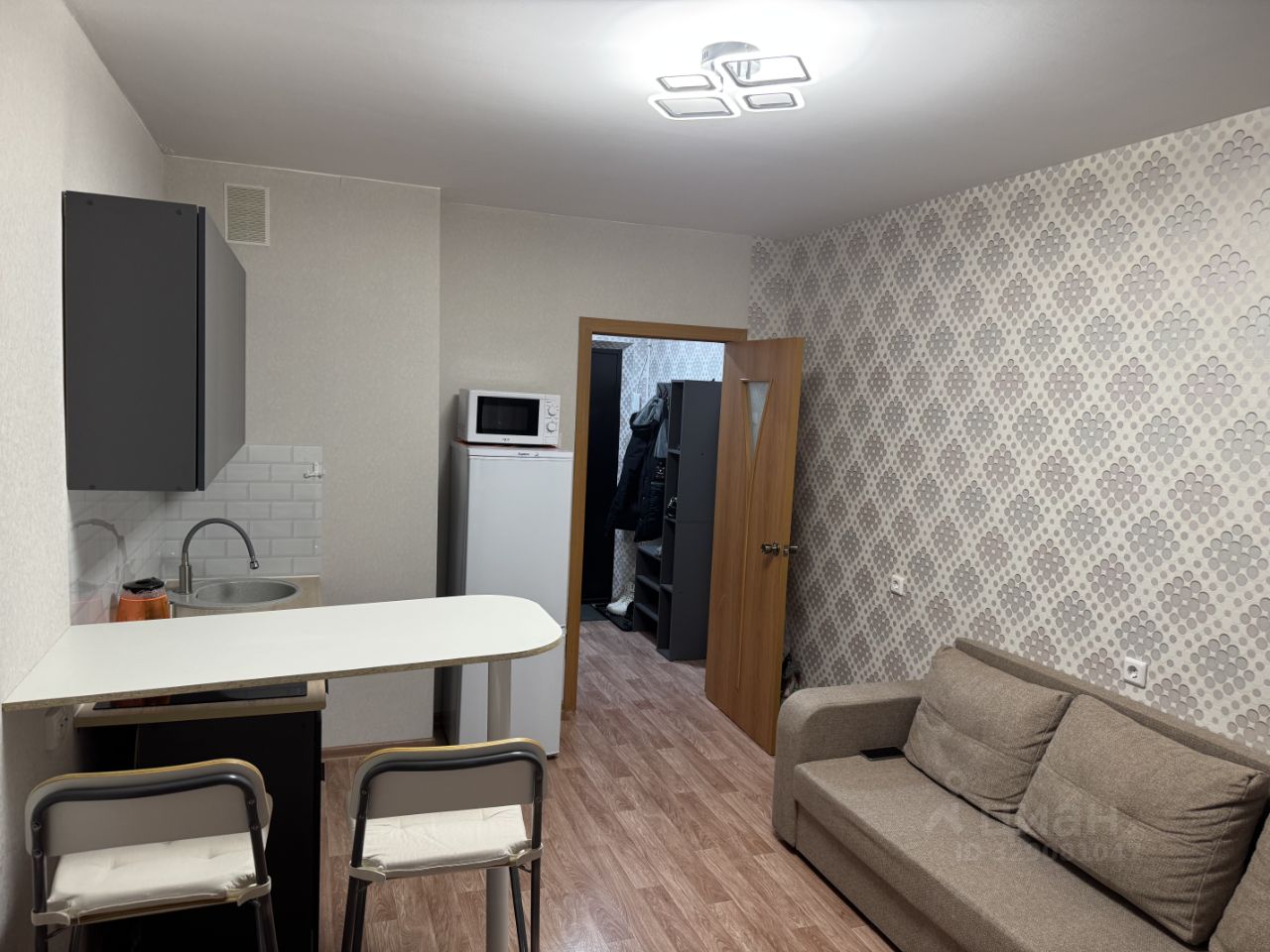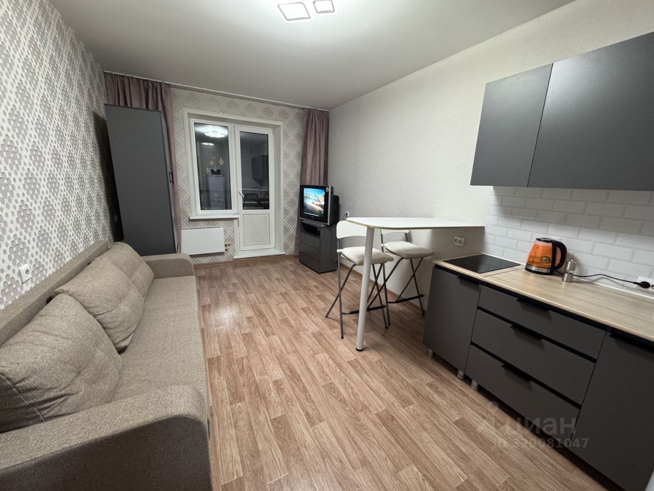 Внутри студии выполнен косметический ремонт. В квартире есть вся необходимая мебель как на кухне, так и в жилой зоне. Из техники в вашем распоряжении: холодильник, телевизор и стиральная машина, микроволновая печь,чайник, варочная панель,Санузел совмещеный,оборудован ванной.балкон есть.
