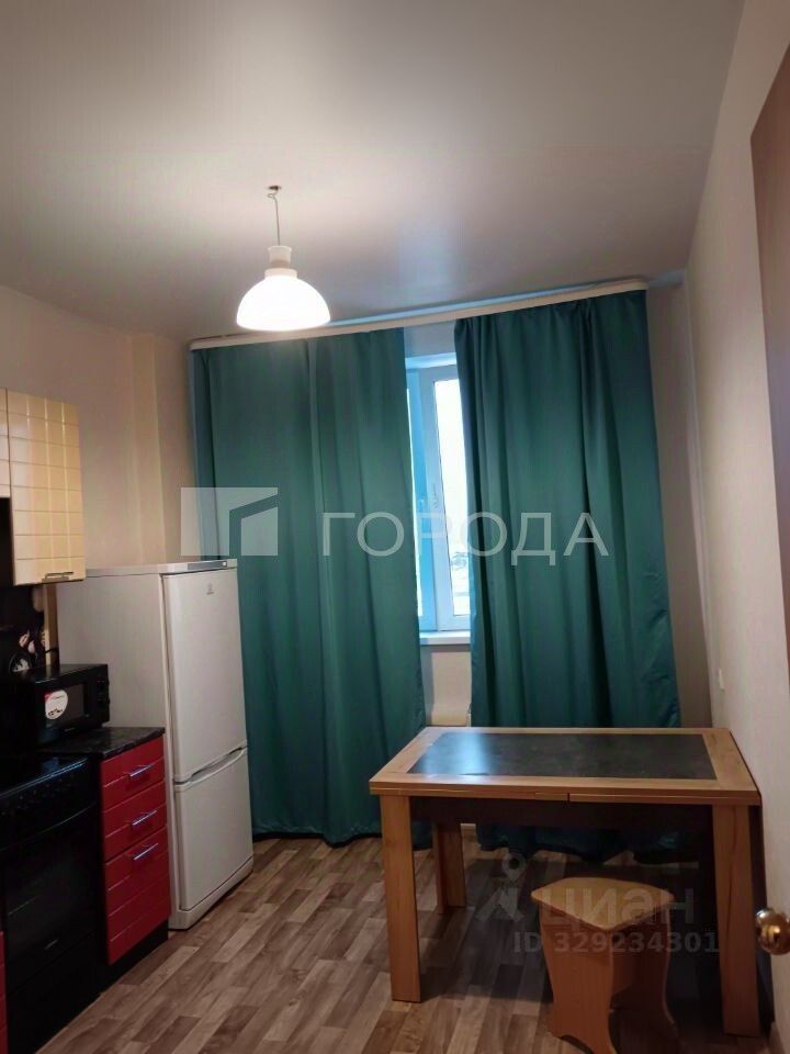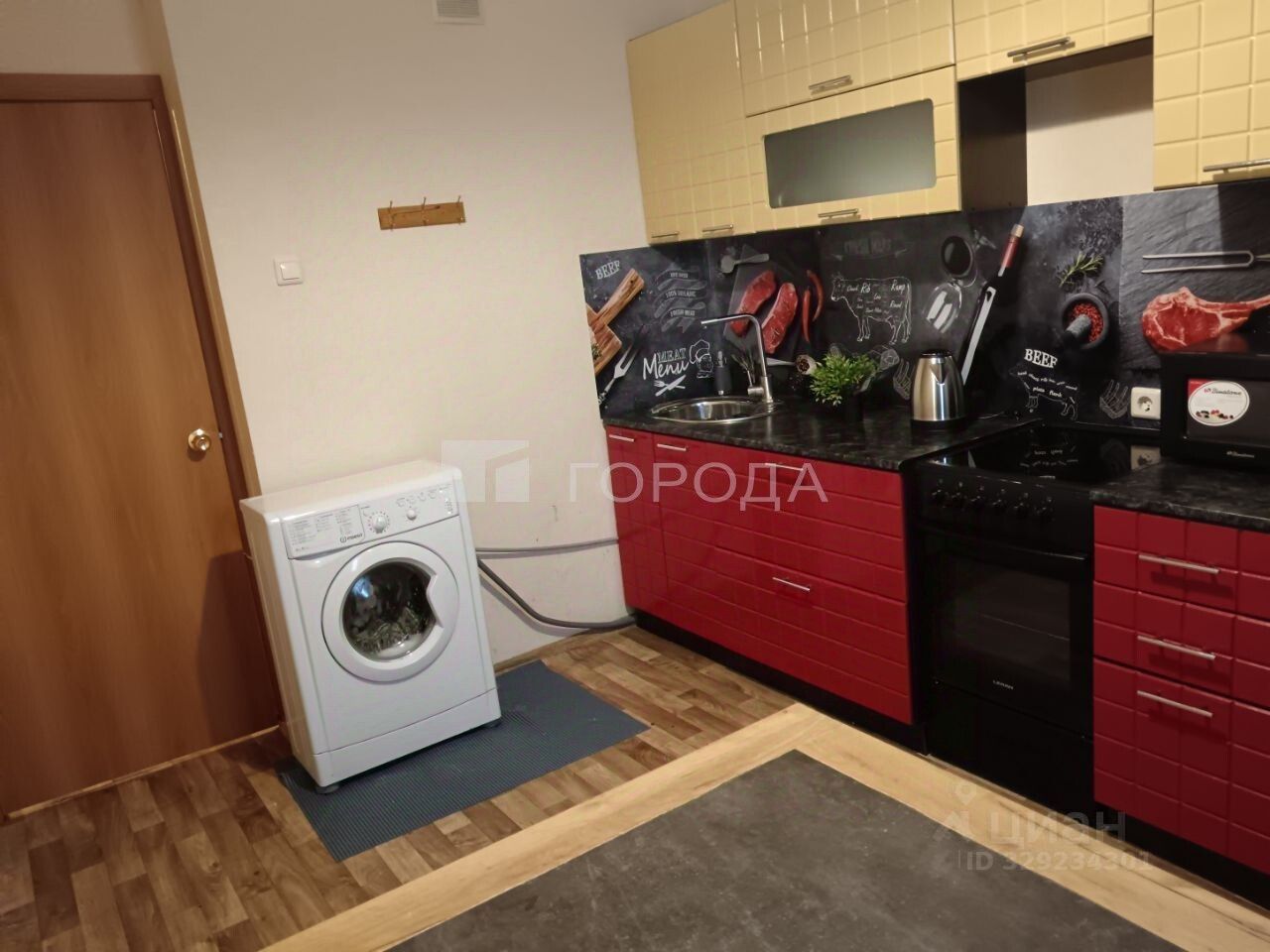 Кухня оснащена всей необходимой мебелью и бытовой техникой: холодильником, микроволновкой, электрочайником, кухонным гарнитуром, посудой, электрической плитой, столом обеденным, стиральной машинкой-автомат. В квартире расположен балкон, а окна выходят во двор, откуда открывается вид на парковку.